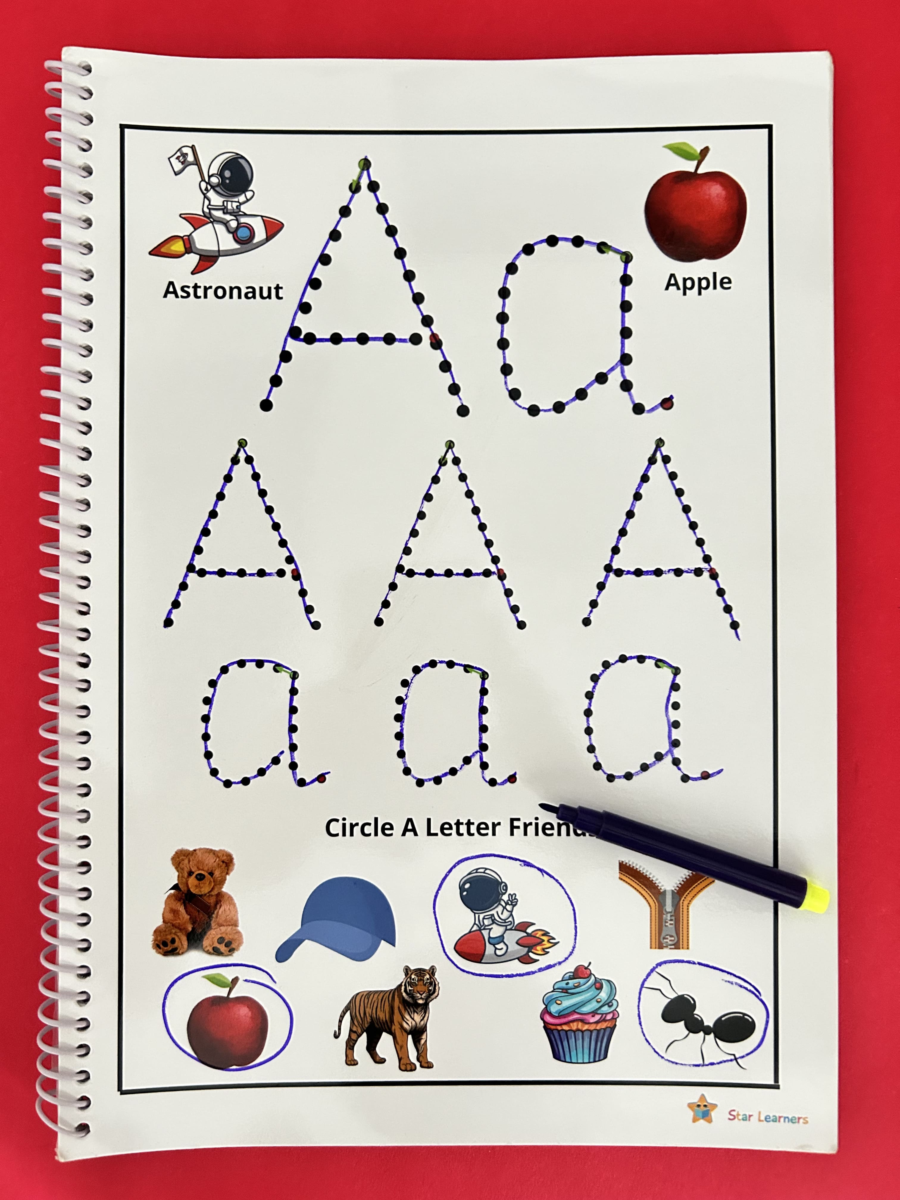 Make learning the alphabet fun and engaging with the Alphabet Friends and Tracing reusable book! This spiral-bound activity book introduces children to uppercase and lowercase letters through interactive tracing exercises and letter recognition activities.