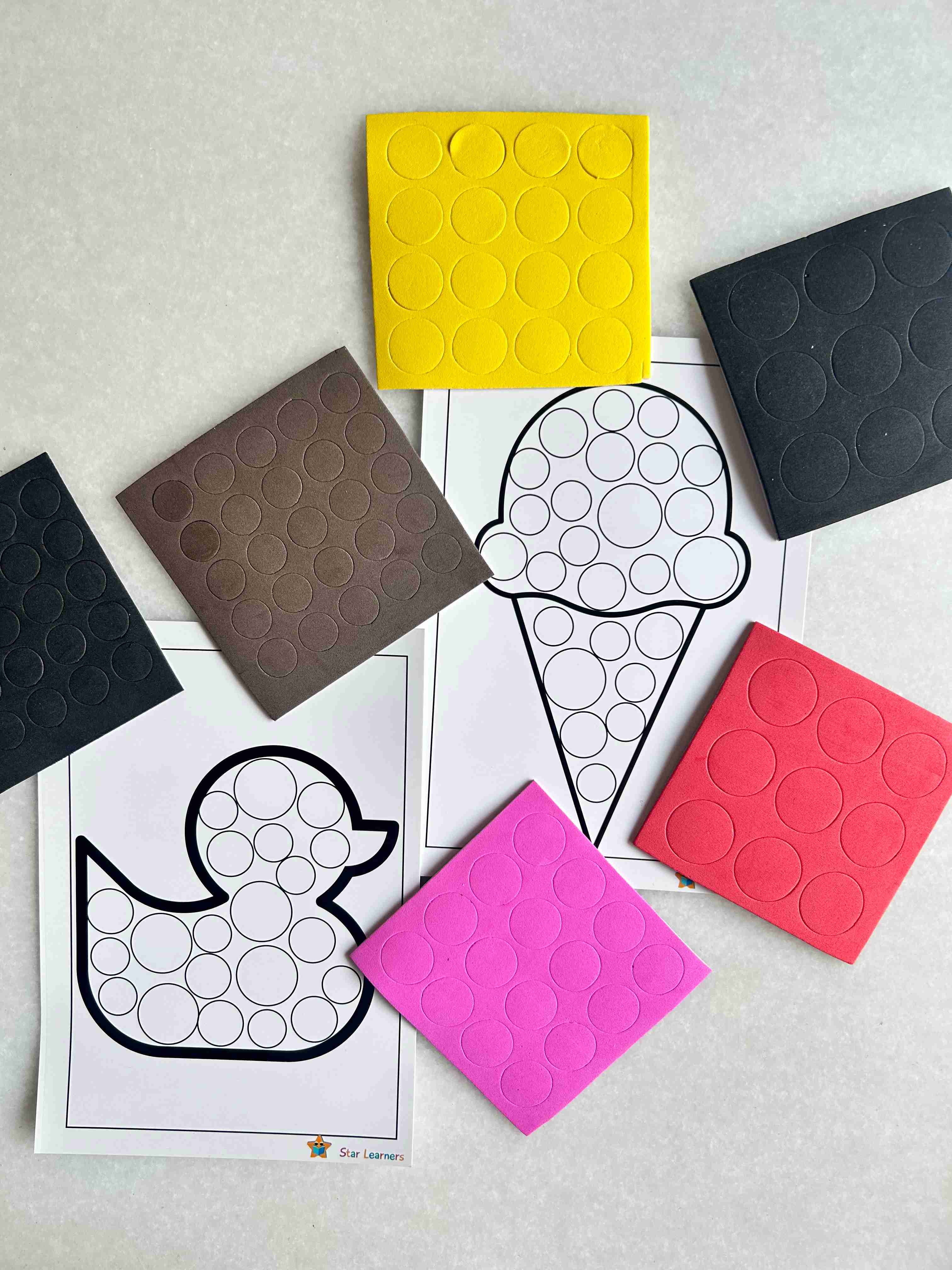Featuring 10 unique shape templates with circle placements, this game is perfect for little hands to explore colors and patterns. The foam stickers come in 6 vibrant colors and 3 different sizes, and best of all, they are reusable!