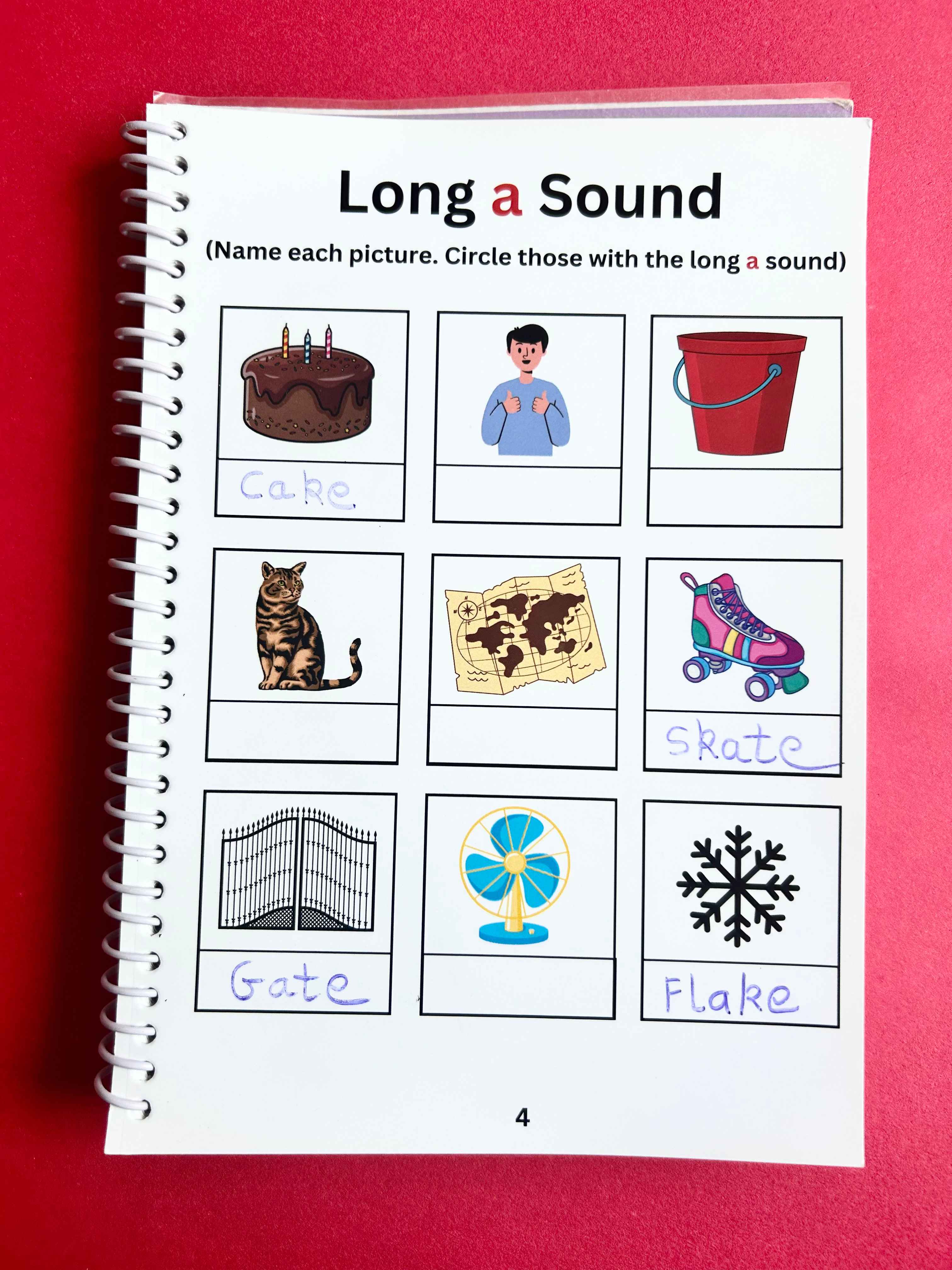 Our Reusable Phonics Book, designed to help children master the fundamental sounds of vowels. This durable, easy-to-use workbook covers both long and short vowel sounds, making it an essential tool for early literacy development.